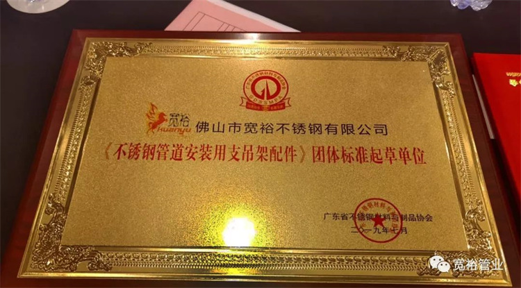 佛山市寬裕不銹鋼有限公司被授予《不銹鋼管道安裝用支吊架配件》團體標準起草單位及起草人牌匾及證書。