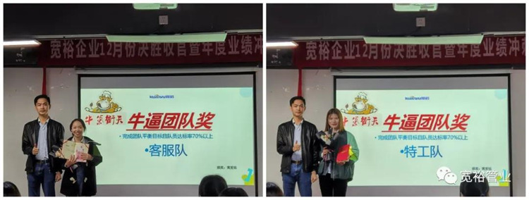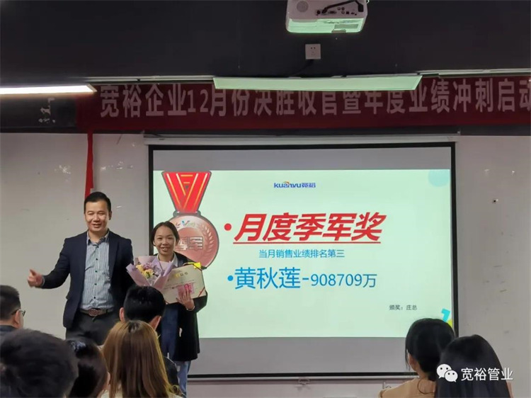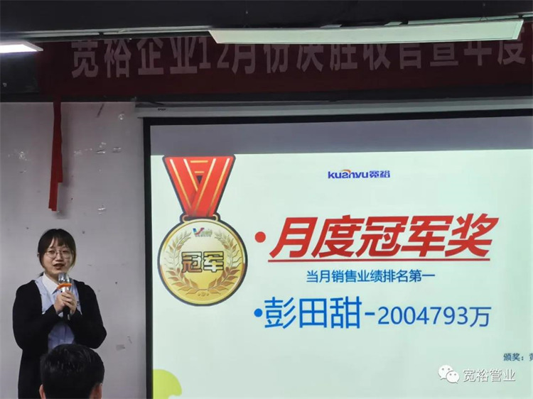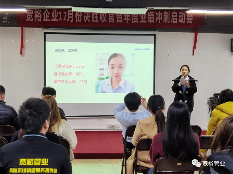 動感滿滿的舞蹈之后正式開啟對12月1-13日的銷售業(yè)績回顧,并對個人銷量前十、團隊業(yè)績完成情況、團隊PK情況等進行了總結(jié)。在過去的13天里,已經(jīng)涌現(xiàn)出了多位優(yōu)秀的將士,他們分別是以100%業(yè)績率先沖刺的00后新生代“小莊”,還有首個拿下本月25萬大單的小斯---從跟單員通過不斷的努力成為優(yōu)秀的銷售工程師。更有通過前期不斷積累了成功開拓經(jīng)驗的來自無敵隊的小黃,12月至今已經(jīng)開發(fā)了6個新客戶,現(xiàn)場更是迎來了“哇塞”的喝彩聲一片!在此小編也僅代表寬裕管業(yè)對各位優(yōu)秀戰(zhàn)士的優(yōu)異成績表示大寫的點贊!你們是最棒的!