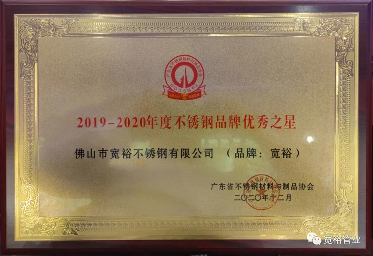 過去10年,寬裕企業載譽無數!12月23日晚再獲殊榮!其中,寬裕品牌榮獲廣東省不銹鋼材料與制品協會頒發的2019-2020不銹鋼行業品牌優秀之星;寬裕企業榮獲“放心消費示范點企業”榮譽稱號!無數榮譽的背后是全體寬裕人共同努力的成功,更有廣大客戶對我們的支持和信任!再次深表感謝!我們定必再接再厲,不斷創新,奮勇向前!
